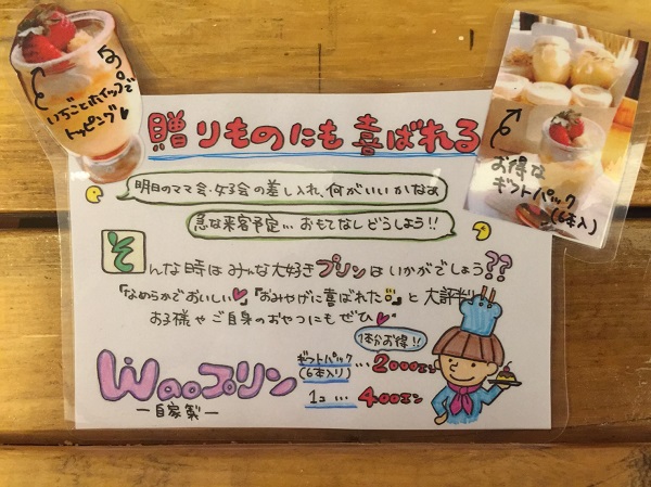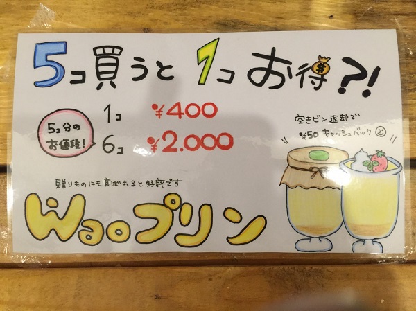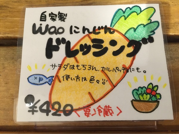 取扱商品 waoプリン waoプリン 価格 400円 ご興味がありましたらお気軽にご連絡ください。 wao にんじんドレッシング wao にんじんドレッシング 価格 420円 ラッピング代 200円 配送をご希望の場合 配送でラッピング希望の場合 ラッピング代200円+箱代216円+送料(振込の場合振込手数料はお客様にてご負担ください) ご興味がありましたらお気軽にご連絡ください。 1